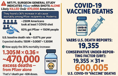 Two independent estimations — one based on VAERS-adjusted data, the other derived from MIT/Florida Dept. of Health study findings — yield a conservative range of 470,000 to 600,000 American deaths from the COVID-19 mRNA shots. The true number is likely much greater.