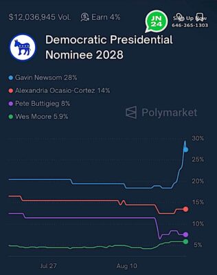 According to Polymarket trading probabilities, the top two Democratic contenders for the 2028 presidential nomination are: